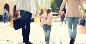 close up of family with child shopping in city